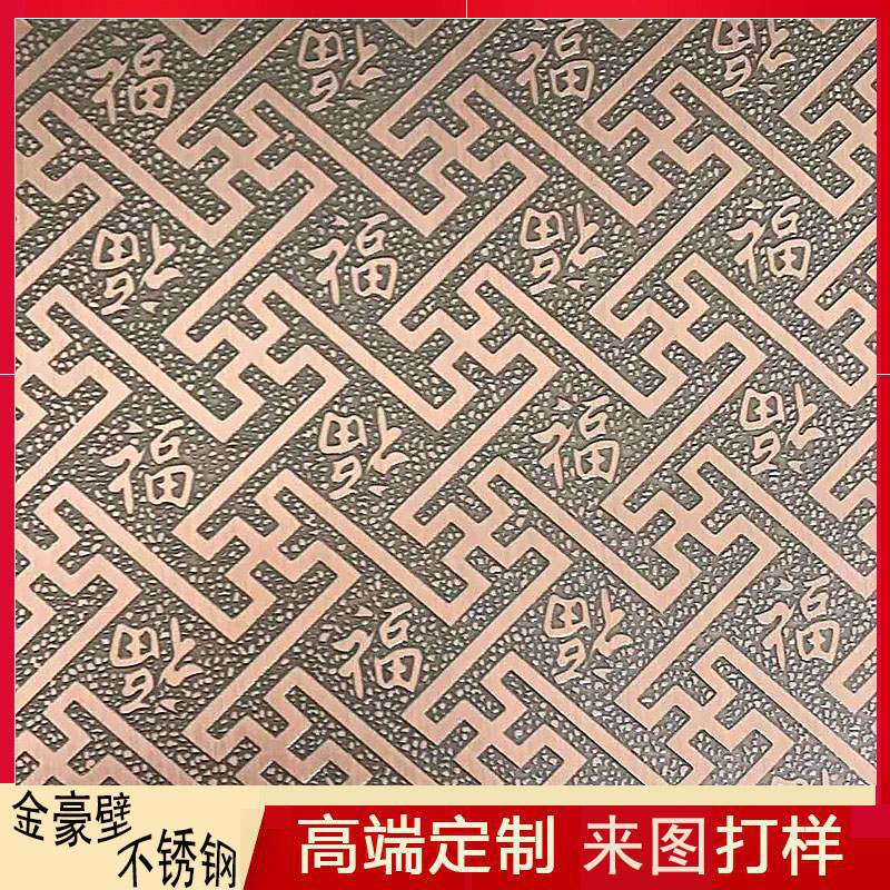 可供選擇的顏色繁多,有玫瑰色古銅色黑色香檳色咖啡色紫紅色寶石藍(lán)色青古銅色紅銅色黃銅色等等,應(yīng)有盡有??晒┻x擇的外表工藝種類也多種多樣,底板以8K鏡面、拉絲等工藝為主,再加上拉絲、和紋等復(fù)雜工藝,使得不銹鋼花紋板的表面紋理清晰、明暗相間,細(xì)節(jié)處精美華麗。
