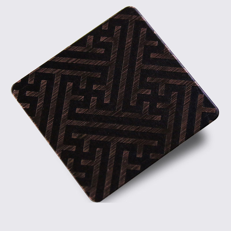 不銹鋼蝕刻板是在不銹鋼表面通過(guò)化學(xué)的方法,腐蝕出各種花紋圖案。以8K鏡面板、拉絲板、噴砂板為底板,進(jìn)行蝕刻處理后,對(duì)物體表面再進(jìn)行深加工,不銹鋼蝕刻板可進(jìn)行局部的和紋,拉絲,嵌金,局部鈦金等各式復(fù)雜工藝處理,不銹鋼蝕刻板實(shí)現(xiàn)圖案明暗相間,色彩絢麗的效果。